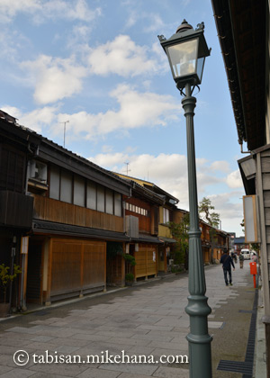 ~~~ 妙立寺からにし茶屋街へ向かった。金沢三茶街の一つで、古風然とした作りの街並みが出迎えてくれた。出格子がキレイ(真新しい観も・・・)で、外からは中の様子がわかりにくいが、内側からはよく見えるとか・・・。格子が独特な形をしているらしい…
